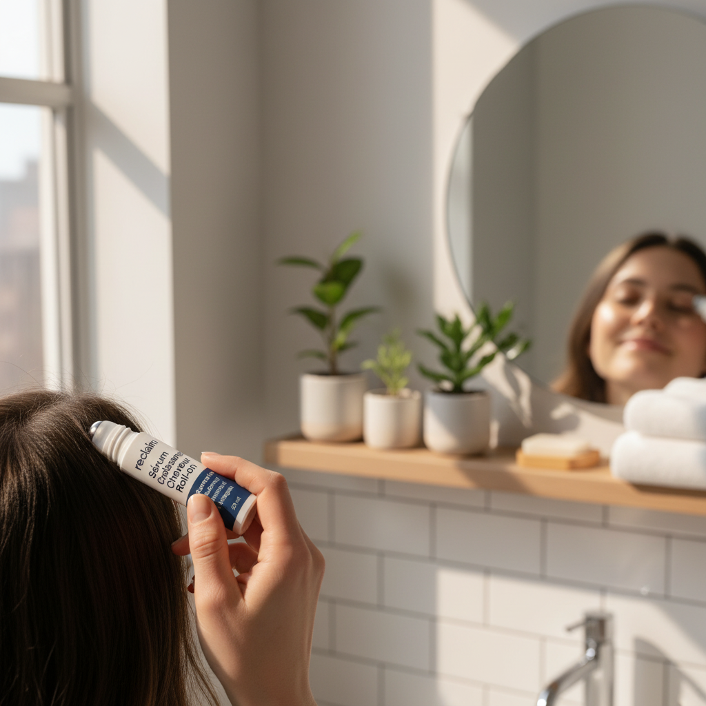 Chute capillaire ralentie. Cuir chevelu revitalisé visible.